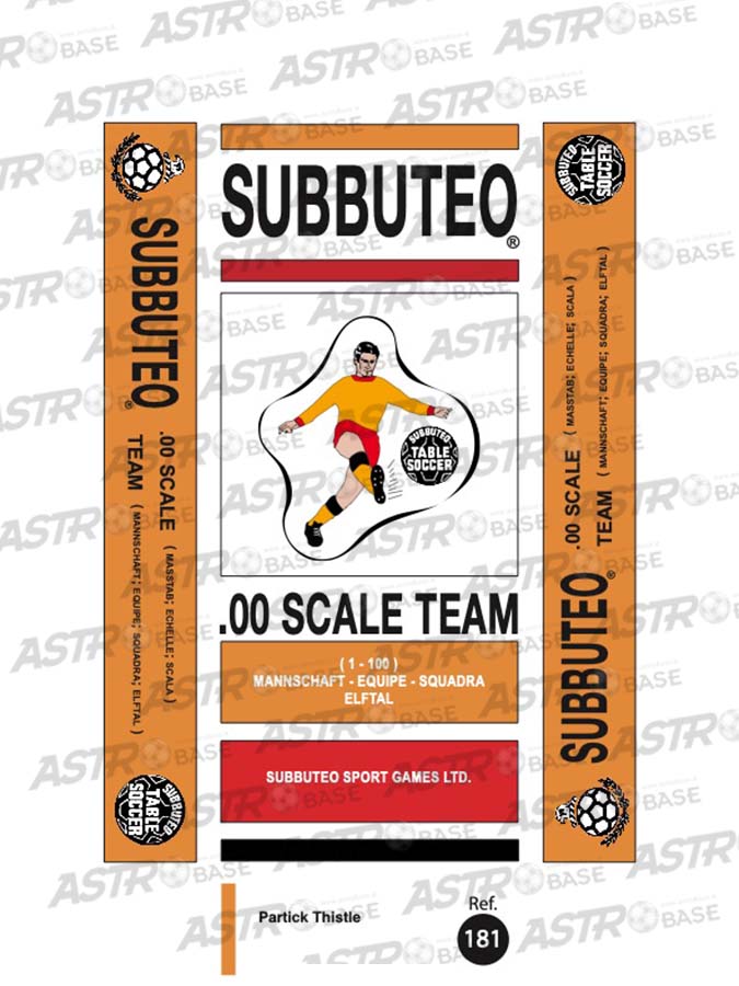 | Squadre replica Subbuteo 1 - 359 | Squadra + 2 riserve e portierino in KIT UGUALE AL PORTIERE SU ASTA – in SCATOLA REPLICA COLORATA (sul coperchio omino – Ref. e nome del team contenuto), Squadra + 2 riserve e portierino in KIT UGUALE AL PORTIERE SU ASTA in scatola Soccer 3D HW, Squadra + 2 riserve e portierino in KIT UGUALE AL PORTIERE SU ASTA in SCATOLA VERDE REPLICA SUBBUTEO anni 70, Squadra in scatola REPLICA COLORATA (sul coperchio omino – Ref e nome del team contenuto), Squadra in scatola Soccer 3D HW, Squadra In Scatola Verde Replica SUBBUTEO anni 70 |
